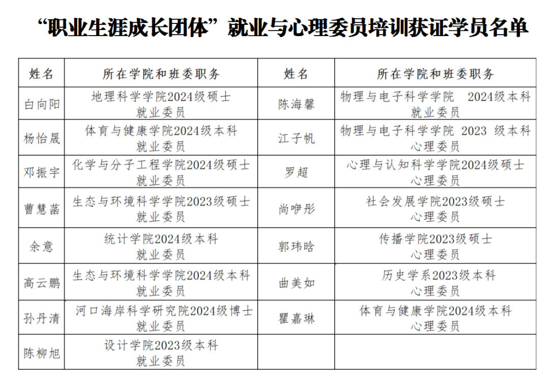 4月17日,由学校学生职业发展中心与学生心理健康教育与咨询中心联合举办的“职业生涯成长团体”就业和心理委员培训活动圆满落下帷幕。本次培训跨时五周10个课时,围绕人格测试、职业倾向分析与生涯规划等核心内容展开,旨在提升学生骨干的职业指导与互助能力,进而推动校园精准就业服务体系和朋辈支持网络的建设。学员们通过此次培训,掌握职业规划的核心方法,为知识传播的种子,将所学反哺给更多同龄人。培训邀请到了本校心理学专业优秀校友、上海市就业咨询委员会专家李益老师,为就业和心理委员深入开展职业生涯讲解并分享宝贵经验。 培训纪实:从“自我认知”到“生涯蓝图” 培训以职业规划为主线,结合MBTI性格测试、霍兰德职业倾向量表等工具,引导学生了解自我,锚定个人特质与职业适配性。在主讲导师李益老师的带领下,学员们通过性格解析、价值观澄清、能力评估等环节,逐步构建个性化的职业发展框架。 “案例分析+小组共创”模式是此次培训的一大亮点。学员分组后围绕 “性格与职业匹配”“行业趋势分析”“实习案例拆解”等主题展开深度讨论。在“五年成长回溯”环节,通过回顾关键人生事件,梳理出影响职业选择的情感动力与价值导向。 培训尾声,20名学员以个人汇报的形式,梳理了此次培训的所学所感。他们从自我认知出发,剖析性格特质与职业适配性。同时,立足行业现状,运用课堂教授的SWOT分析法,对目标行业竞争格局、岗位需求趋势展开讨论,并设计个性化的生涯发展规划,展现了从“探索者”到“行动者”的蜕变。 学员心声:在朋辈互助中“共见蜕变” 职业生涯规划课程,让我懂得合理规划是开启职业理想大门的钥匙,分阶段目标能指引前行方向。老师分享行业前沿动态,让我意识到岗位变化迅速,唯有不断学习、保持敏锐,才能紧跟步伐。此次培训不仅提升我的专业知识,更赋予我助力同学就业的信心与能力。往后我会将所学运用实践,为大家求职之路添砖加瓦。 ——地理科学学院2024级硕士研究生 白向阳(就业委员) 在生涯规划学院组织的五次专题培训中,老师们以专业视角拆解职业规划的核心逻辑,从行业趋势剖析到个人定位方法,每一堂课都干货满满;不同专业、年龄的同学们分享各自独特的经历与见解,多元的思维碰撞带来全新启发。作为班级就业委员,我将以培训所学为依托,用更专业的知识、更温暖的关怀,为同学们驱散就业迷茫。 ——体育与健康学院2024级 杨怡晟(就业委员) 很荣幸能参与和学习“职业生涯成长团体”就业和心理委员骨干培训。它让我更加全面了解自己的性格及对应的岗位,学会如何发展性看待自己的职业生涯和如何规划落实职业规划。在这次职业学习中收获匪浅,也希望所学来的知识能为以后班级里有就业疑惑的同学提供帮助。 ——化学与分子工程学院2024级硕士研究生 邓振宇(就业委员) 在培训中,通过职业测评、小组讨论、案例分析,我更加清晰地认识了自己的优势与待提升的方向。导师的引导式提问也让我学会了用更系统的方式规划职业路径,而不是人云亦云随波逐流。未来希望可以将自己在培训中的所学帮助到更多需要帮助的同学,为同学们的就业服务贡献出自己的力量。 ——生态与环境科学学院2023级硕士研究生 曹慧菡(就业委员) 经过五次的培训,老师的讲授以及不同专业和年龄的同学们的分享,使我对如何规划未来职业有了系统的认识和思考,不再像过去一样茫然。同时作为班级的心理委员,面对同学们对就业的迷茫和困惑,我也会以更专业的知识去帮助他们找到未来的方向。 ——历史学系2023级 曲美如 (心理委员) 在老师的帮助下,我对原本片段式的职业发展设想有了一个更清晰的职业生涯设计,不仅加深了对自己的理解,而且明确了存在的机会和挑战。另外,看到其他同学的经历和体会,也丰富了我看待职业发展的视角,大家在一起,提供能量,互相滋养。再次感谢老师和同学们,希望每一个人都走出属于自己的职业生涯之路! ——心理与认知科学学院 2024级 罗超(心理委员) 通过参与此次职业生涯培训,我深刻体会到自我认知是职业规划的基石。培训中,SWOT工具帮助我聚焦优势,例如通过热线实习快速建立信任、在朋辈谈话中实践倾听技术,同时直面短板。下一步,我将以朋辈支持为起点,扎实沉淀个案经验,让理想主义的初心在务实行动中生根。 ——传播学院 2023级硕士研究生 郭玮晗(心理委员) 未来展望:以“种子”之力,构建朋辈支持网络 此次培训以“赋能学生骨干,辐射互助网络”为目标,通过五周系统教学实现了从理论到实践的转化。结业并非终点,而是全新的起点。未来,学校将深入洞察学生的职业发展需求,持续推出更多兼具专业性与趣味性的职业规划与心理成长相关活动,助力构建“精准化、梯队式”的朋辈就业支持体系。