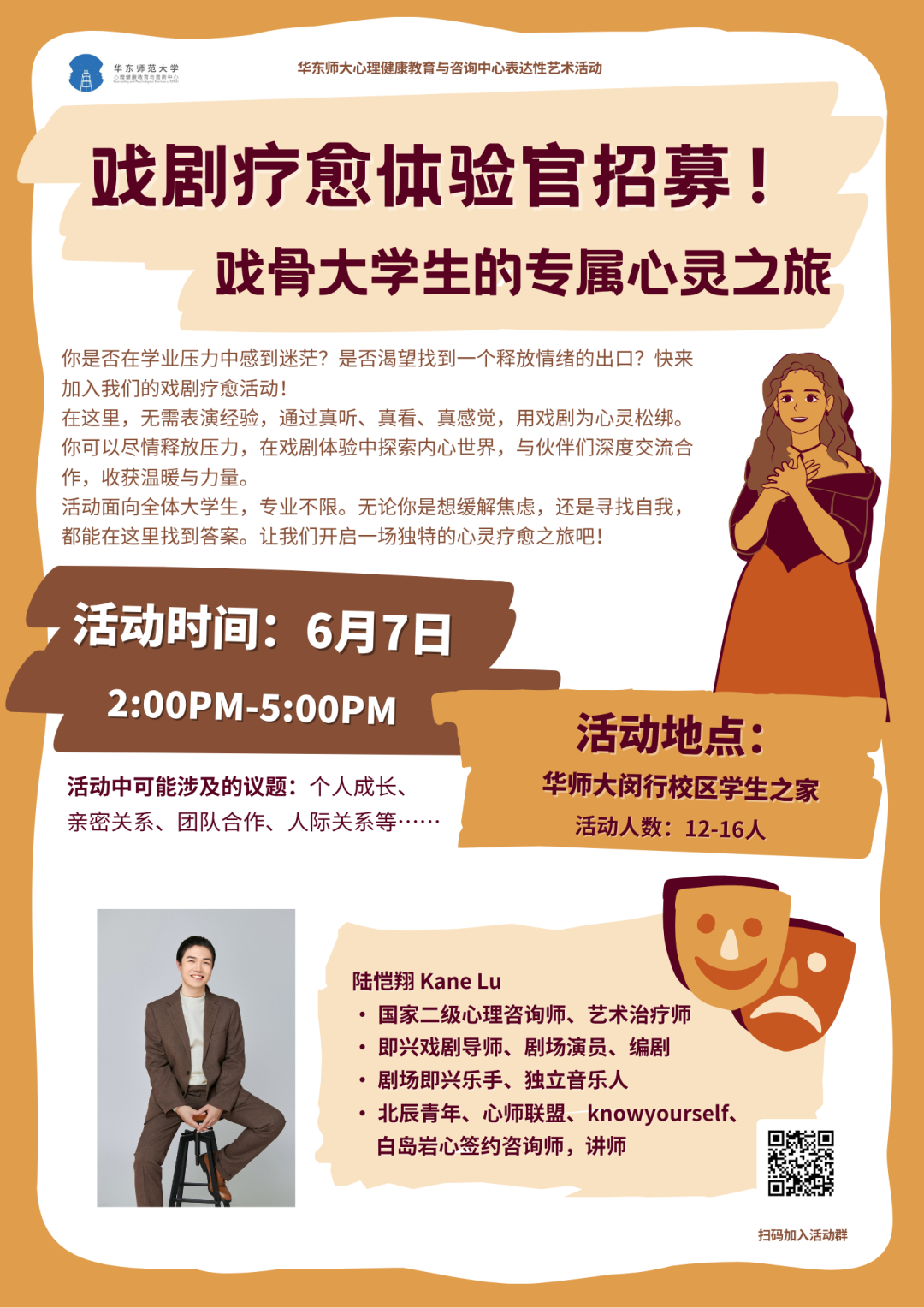 又是一学期临近期末的时候了,无论你是忙碌还是从容,都欢迎来到表达性艺术疗愈的天地中来安顿自己。活动就在本周,普陀和闵行校区各一场,欢迎扫描下方二维码报名!